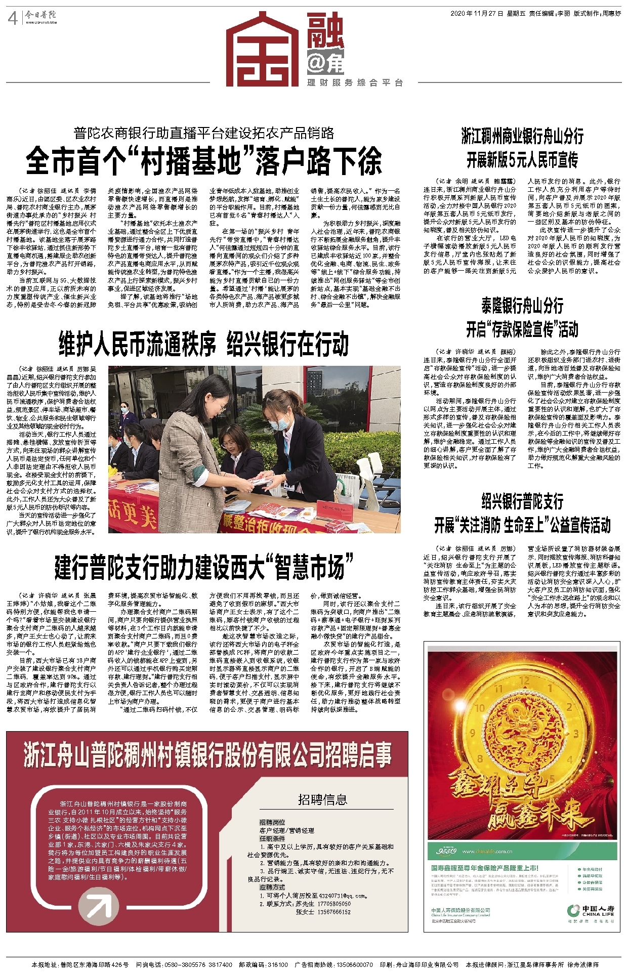 浙江稠州商业银行舟山分行 开展新版5元人民币宣传