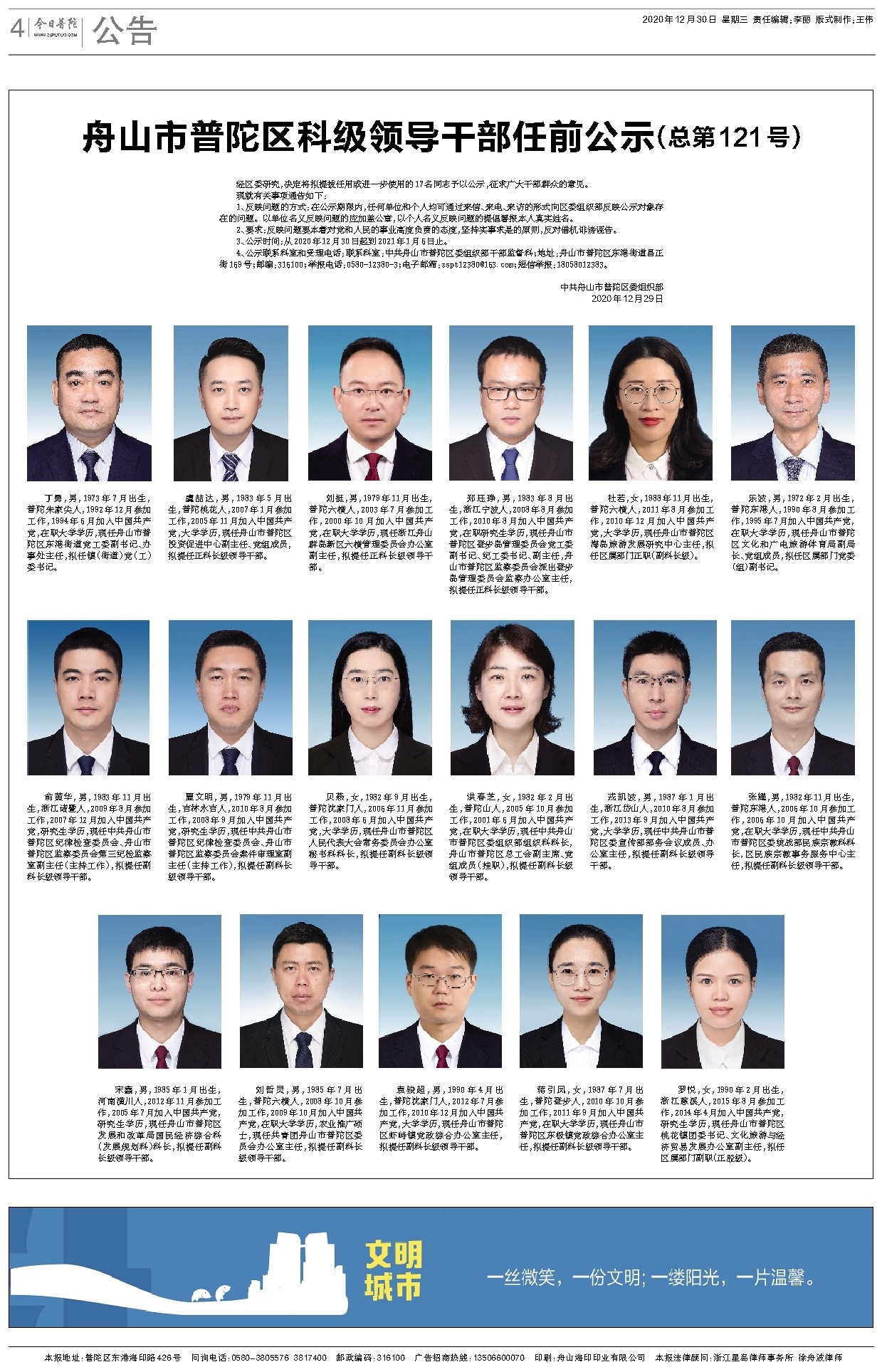舟山市普陀区科级领导干部任前公示(总第121号)