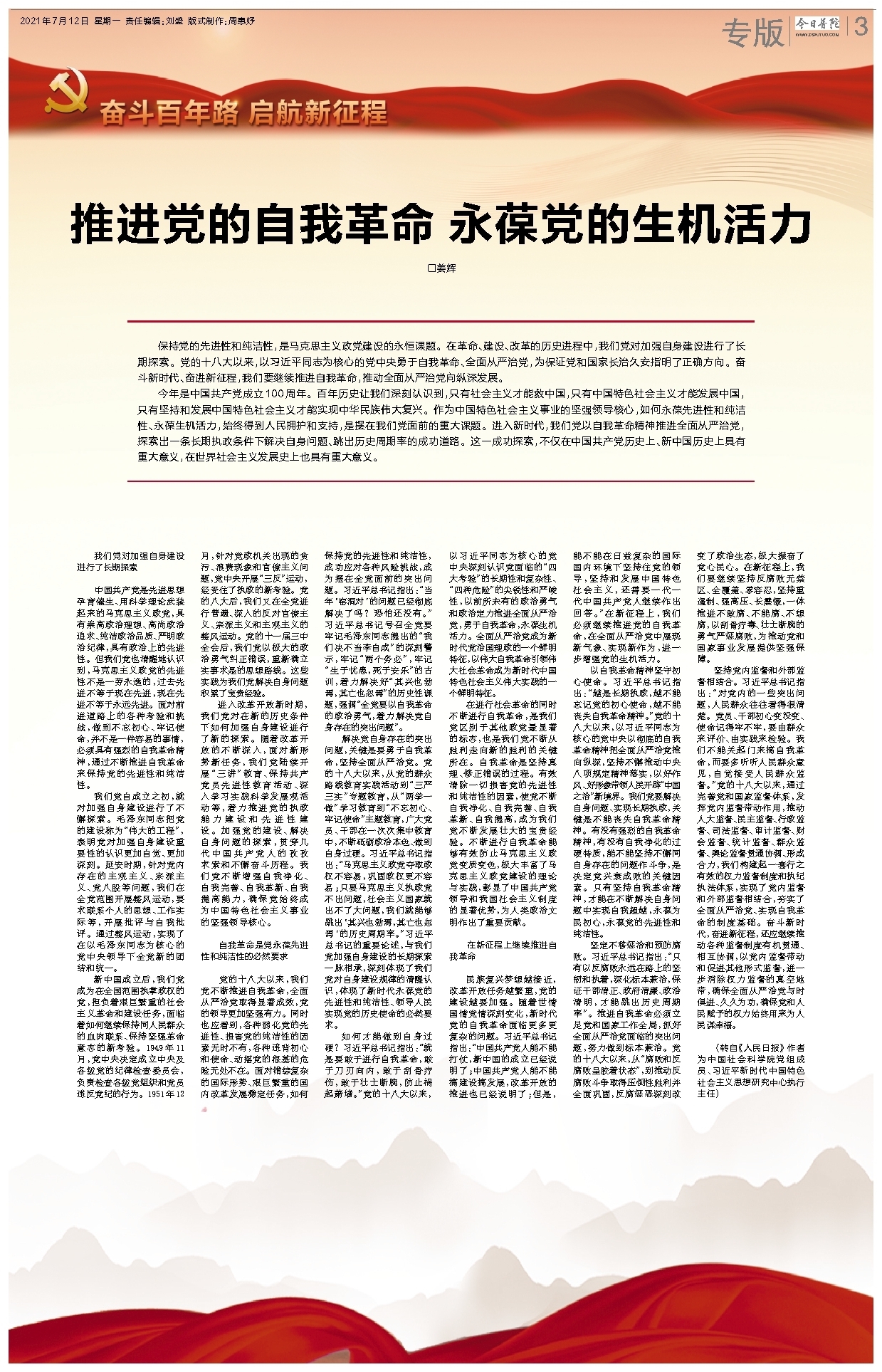 推进党的自我革命 永葆党的生机活力