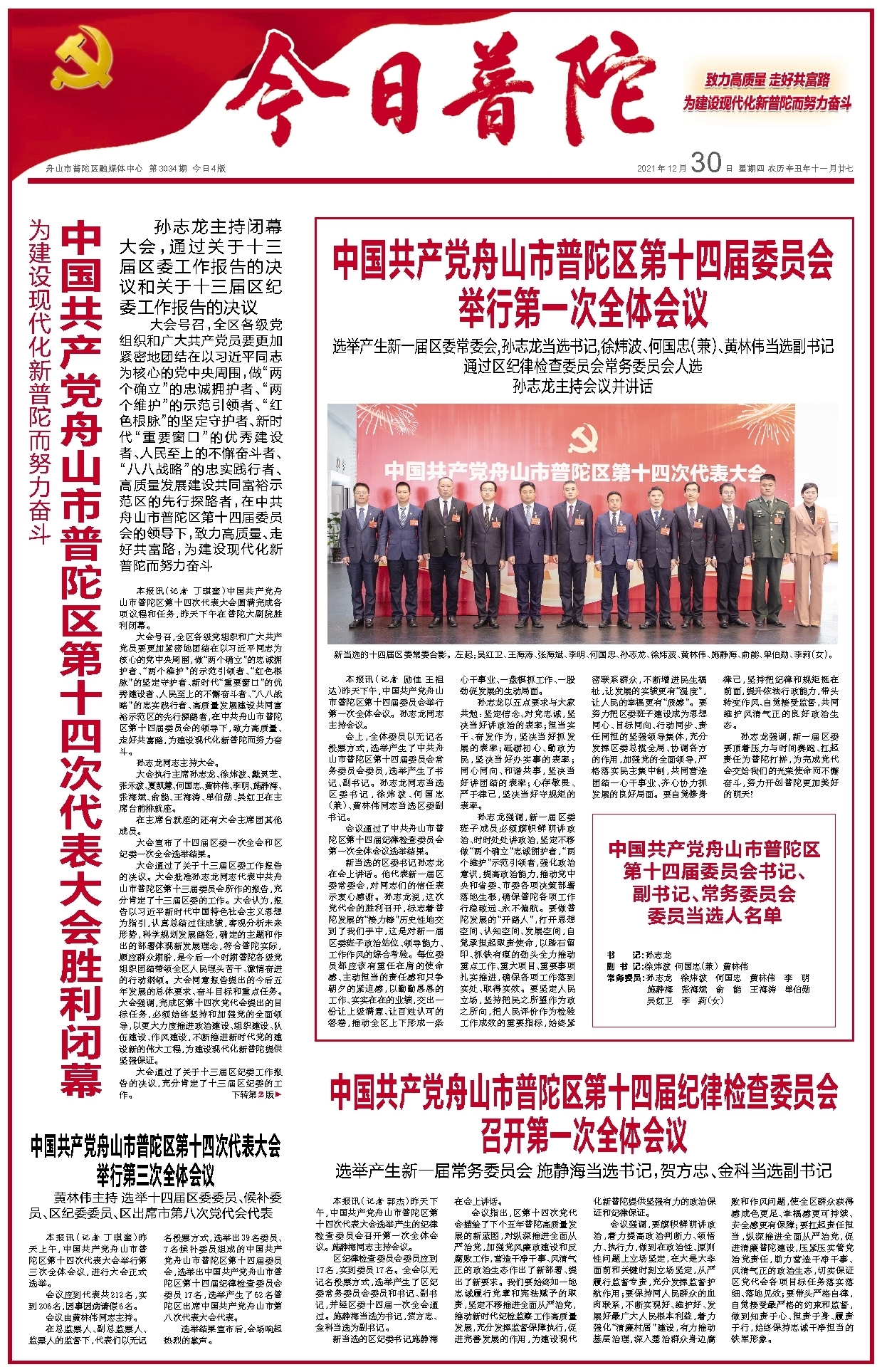 中国共产党舟山市普陀区第十四届委员会 举行第一次全体会议